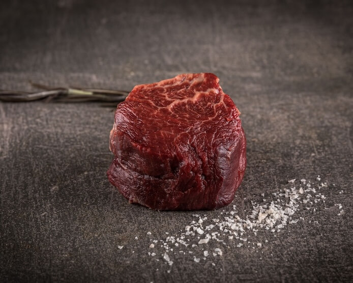Das Filet ist – nicht nur beim Rind – das wertvollste Teilstück, denn der auf beiden Seiten der Wirbelsäule liegende Cut bringt nur circa zwei Prozent des Schlachtgewichts auf die Waage. Der zu Lebzeiten nur wenig beanspruchte Fleischmuskel ist besonders zart. Unser Txogitxu-Filet ist absolutes Premiumfleisch mit einem relativ geringen Fettgehalt in feiner Marmorierung und einem hervorragenden Aroma.