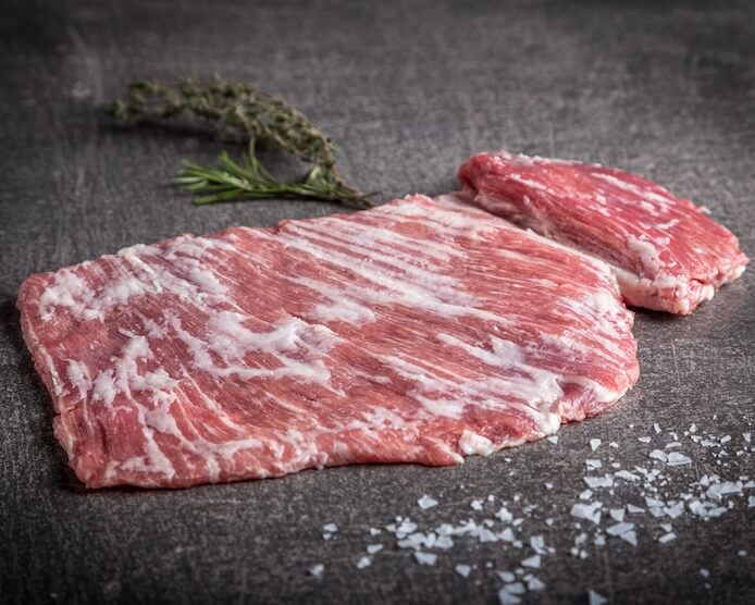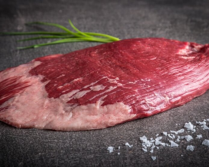 Das Flank Steak stellt auf dem amerikanischen Kontinent einen der beliebtesten Cuts dar, denn der flache Muskel ist relativ mager und sehr intensiv im Aroma. Mit seiner feinen Marmorierung hat das Flank einen besonders markanten Geschmack. Das Fleisch vom Black Angus besitzt, genetisch bedingt, kräftige Muskelstränge mit feinen Fasern. Saftiger und zarter Steakgenuss mit einem herrlichen Aroma.