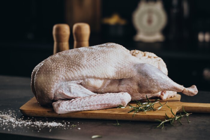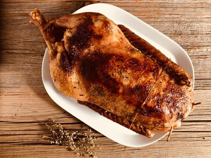 Die Gans auf ein Ofengitter setzen und etwa 3 ½ bis 4 Stunden im auf 150° C vorgeheizten Backofen kross braten. Etwas Butter schmelzen lassen, mit Salz mischen und die Gans zwischendurch damit bestreichen. Kurz vor dem Servieren die Temperatur erhöhen, bis die Gans die optimale Bräunung angenommen hat. Damit die Haut richtig knusprig wird, sollte das Geflügel immer wieder mit Salz- oder Honigwasser bestrichen werden.